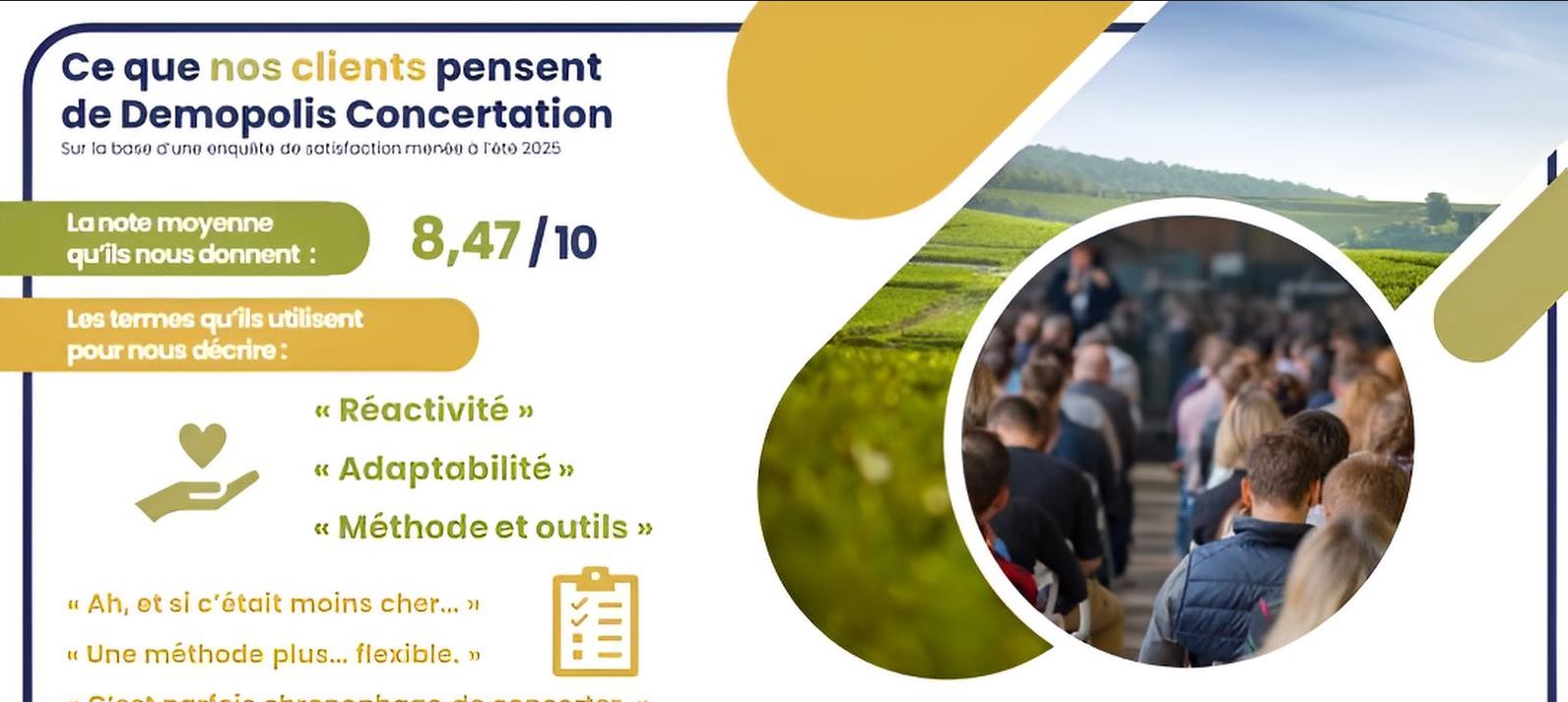 Comme chaque année, Demopolis Concertation, a demandé à ses clients ce qu’ils pensaient de notre accompagnement. Une quinzaine ont accepté ! Résultat : une note